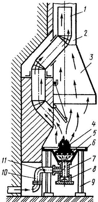 Более совершенная конструкция открытого горна показана на рис. 1.1.5. Горновая чаша (п.6) с чугунной решеткой (п.5), а также фурма (п.7) с крышкой (п.8) крепятся на сварной металлической подставке (п.9). Воздух от вентилятора подается в очаг горна по трубе (п.10) и регулируется заслонкой (п.11). Уголь (п. 4) закладывается на чугунную решетку, а газы удаляются через зонт (п.3) и две трубы (п.1) и (п.2). При прохождении дыма через наружную трубу внутренняя нагревается, что улучшает тягу. Зола и шлак, которые накапливаются на дне зольника, удаляются при открытии крышки (п.8).