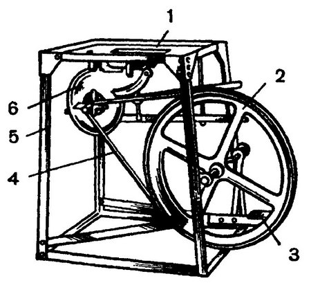 Переносной горн (рис. 1.1.6) состоит из металлической рамы (п.5), на которой сверху крепится стол с очагом (п.1) и вентилятором (п.6) для подачи воздуха. Вентилятор приводится во вращение от ножной педали (п.3)через кривошип, маховик (п. 2) и ременную передачу (п. 4). Они имеют небольшой вес и маленькие габариты и поэтому используются для ковки лошадей в полевых условиях, для устройства показательных выступлений кузнецов на различных праздниках и фестивалях. На рис. 1.1.7 показаны переносные горны (конструкции США).