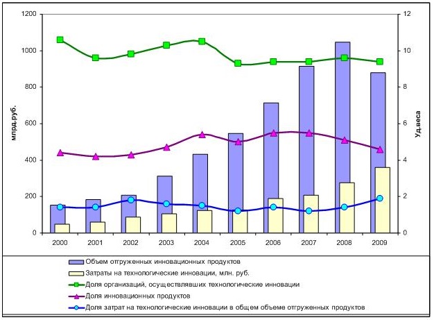 Согласно рисунку объем отгруженных инновационных товаров (выполненных работ, оказанных услуг) существенно вырос за последние 10 лет, за исключением кризисного 2009 года. В то же время затраты на технологические инновации растут не такими быстрыми темпами.