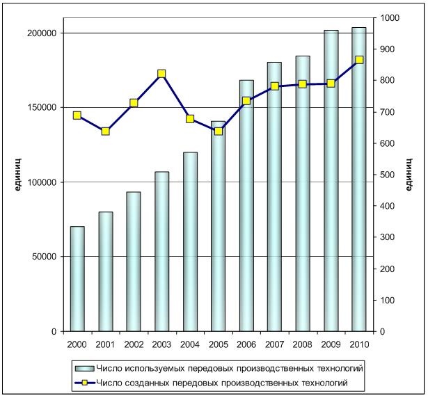 Как видно из приведенной диаграммы, наблюдается рост числа используемых передовых технологий и числа созданных передовых технологий. При этом темпы роста числа используемых передовых технологий выше темпов роста числа созданных передовых технологий.