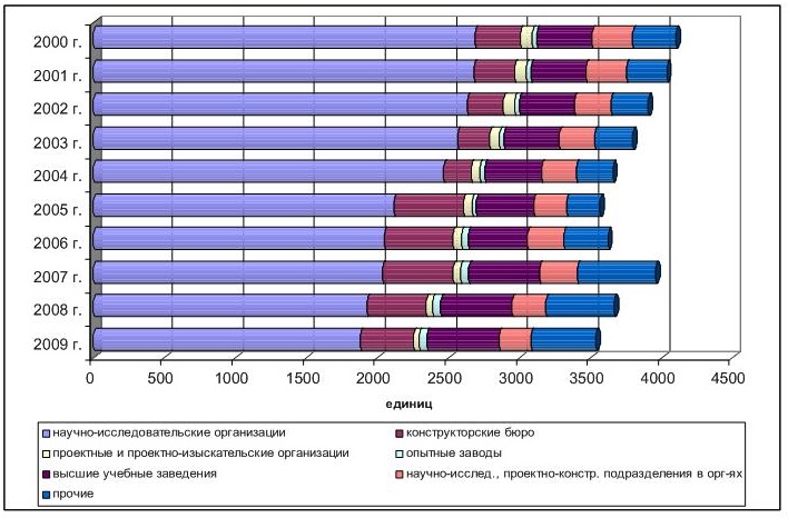 Положительная динамика наблюдается по высшим учебным заведениям (прирост 29,7 %), опытным заводам (их стало больше на 24, или на 72,7 %), конструкторским бюро (прирост 18,5 %) и прочим организациям (прирост 49,8 %).