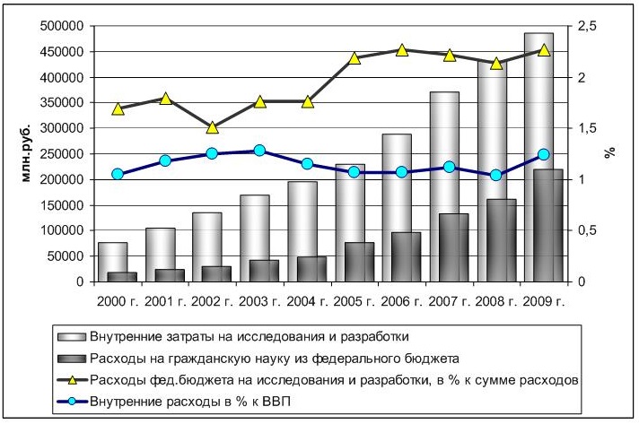 Внутренние затраты организаций на исследования и разработки растут более высокими темпами, однако, если отнести их к ВВП, будет очевидно, что особых изменений в величине затрат на исследования и разработки не наблюдается. Несколько изменилась доля расходов федерального бюджета на науку в общей сумме федеральных расходов – с 1,69 до 2,27 %.