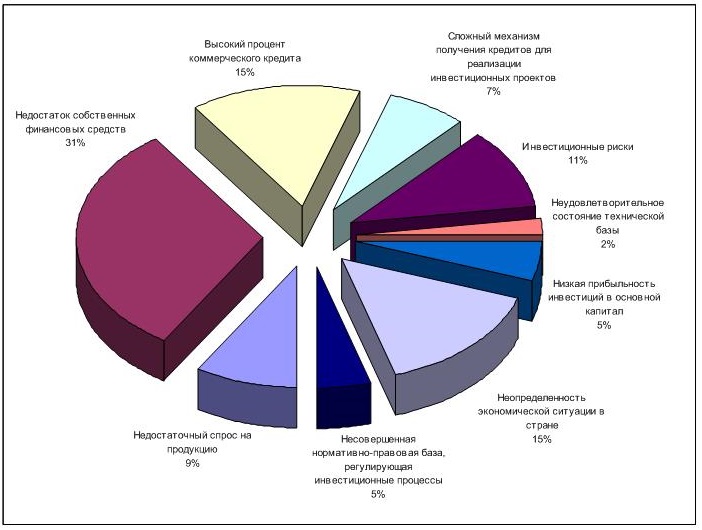 Вполне соответствует применяемому типу механизма инвестирования и его ограничениям распределение целей инвестирования в основной капитал. По данным Федеральной службы статистики, «основной целью инвестирования в основной капитал в 2010 г., как и в предыдущие годы, являлась замена изношенной техники и оборудования, на это указали 67 % респондентов (в 2009 г. – 64 %, в 2000 г. – 56 %). Инвестиции с целью повышения эффективности производства (автоматизация или механизация существующего производственного процесса, внедрение новых производственных технологий, снижение себестоимости продукции, экономия энергоресурсов) осуществляли 32– 46 % организаций; цели, связанные с увеличением производственных мощностей с неизменной номенклатурой продукции преследовали 32 % организаций, а с расширением номенклатуры выпускаемой продукции – 29 %»19.