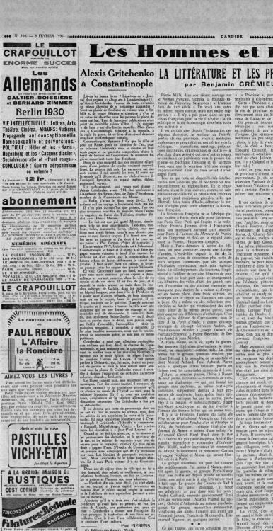 Вырезка из газеты Candide от 3 февраля 1931 (С. 3) с рецензией на книгу А. Грищенко «Два года в Константинополе» (Париж, 1930)