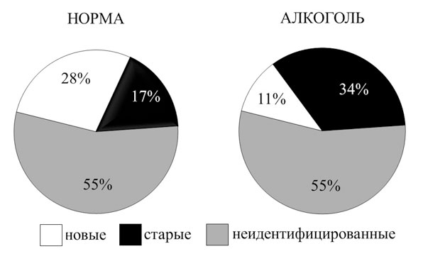 Относительное число нейронов с неидентифицированной специализацией (н/и; не удается выявить постоянную связь изменения частоты их активности с актами анализируемого поведения) не меняется. В то же время видно уменьшение (с 28 % до 11 %) относительного числа активных нейронов, принадлежащих к наиболее новым (Нов) дифференцированным системам, сформированным на последнем, непосредственно предшествующем регистрации активности нейронов этапе индивидуального развития (обучение животных инструментальному пищедобывательному поведению), и увеличение (с 17 % до 34 %) относительного числа активных нейронов, принадлежащих к системам, сформированным на ранних этапах индивидуального развития («старые»; Ст). При этом достоверно возрастало число ошибок в поведении. Специальные подсчеты (произведенные при учете числа активных нейронов, обнаруженных при движении микроэлектрода сквозь толщу коры) показывают, что отмеченное выше изменение относительного числа нейронов обусловлено достоверным уменьшением абсолютного числа активных нейронов новых систем после введения алкоголя. После завершения действия алкоголя число активных нейронов новых систем возвращается к норме.