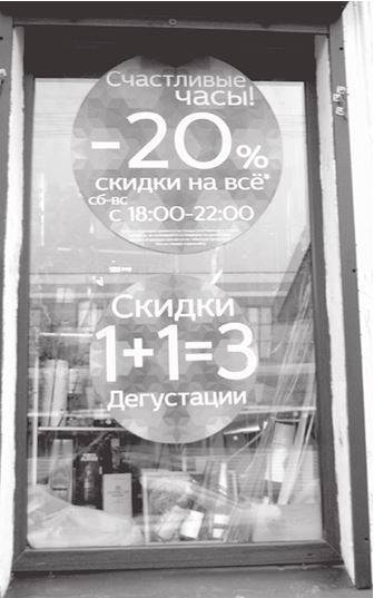 Помимо выставленных товаров и их ценников, продающие витрины часто дополняются размещаемыми с внутренней или внешней стороны стекла рекламными объявлениями, которые должны стимулировать интерес прохожих и мотивировать их на покупку. Чаще всего объявления в витринах представляют собой простые текстовые плакаты, выполненные в самом дешевом варианте на бумаге или изготовленные из пластика на плоттере, без иллюстраций, обычно с довольно стандартным текстом (ил. 1). Вот несколько примеров наиболее часто используемых в этих текстах аргументов, которые, по мнению рекламных специалистов, должны стимулировать прохожих к совершению покупки: «распродажа», «цены снижены на 15 %», «сегодня низкие цены», «скидки», «у нас самые низкие цены в городе», «цены – ниже не бывает», «в воскресенье (или после 23:00) скидка каждому покупателю 15 %»; «после 22 часов все товары по цене 20 рублей» и т. д.