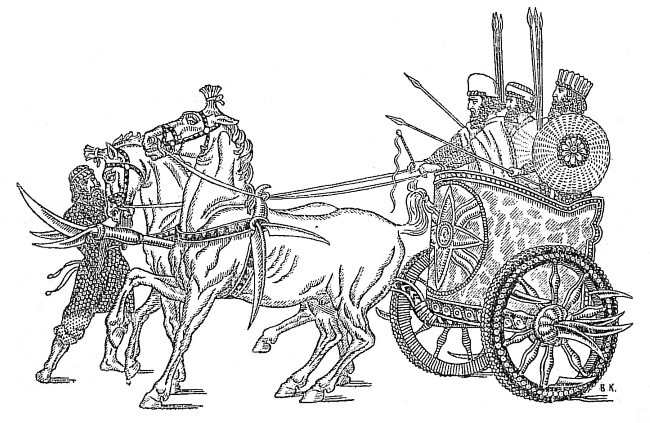 Этим и исчерпываются наши источники о введении данного типа оружия, одно из которых – спорно, а второе – просто неверно. Поэтому в историографии и возникли различные гипотезы о происхождении серпоносных колесниц14.