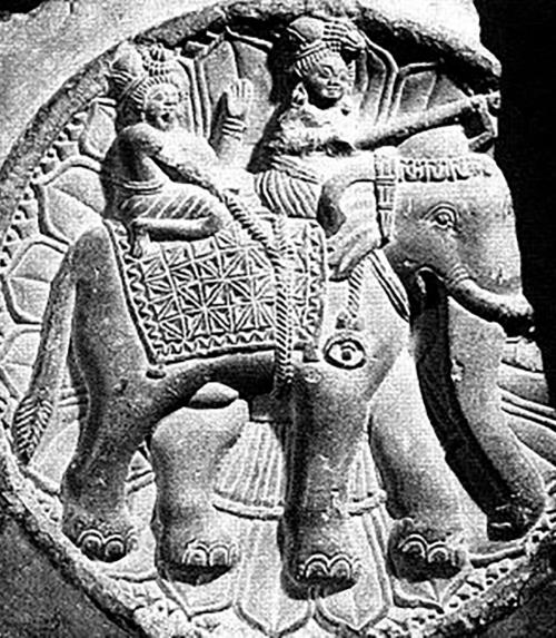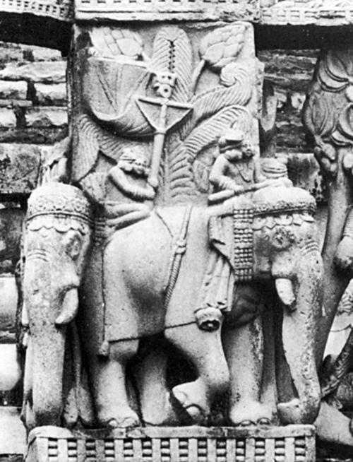 Рис. 2. Князь и его знаменосец на слоне. Большая ступа в Санчи (последние века до н. э. – I в. н. э.). Воспроизведено по: Bernard P. Le monnayage d’Eudamos, satrape grec du Pandjab et “maître des éléphants” // Orientalin losephi Tucci memoriae dicata. Roma, 1985. Pl. III, 8.