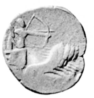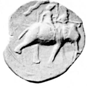 Рис. 3. Тетрадрахма (конец IV в. до н. э.). Князь в панцире с луком стоит в колеснице слева от возницы. На боевом слоне сидят воины с волосами, собранными в пучки. Воспроизведено по: Bernard P. Le monnayage d’Eudamos, satrape grec du Pandjab et «maître des éléphants’ // Orientalin losephi Tucci memoriae dicata. Roma, 1985. Pl. I, 4.