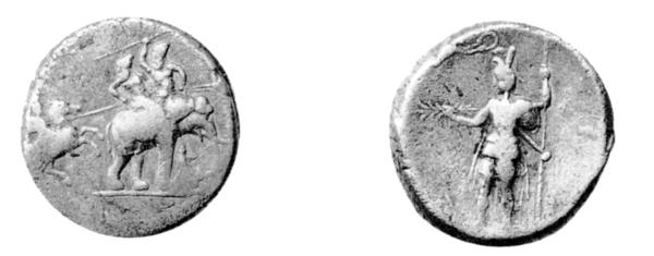 Рис. 4. Декадрахма Александра Македонского, представляющая победу этого царя над индийским раджой Пором (326 г. до н. э.). Аверс: Александр на Букефале преследует индийского боевого слона. Реверс: Александр в облике божества с перуном венчается венком Никой. Воспроизведено по: Нефедкин А.К. Элефантерия прошлого // Pbn. № 2 (35). 2014. С. 85, рис. 4.