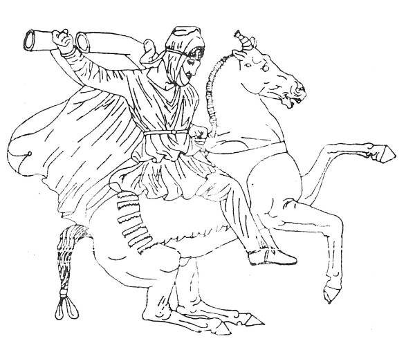 Знатный персидский всадник, сражающийся копьем. Барельеф западной продольной стороны «Саркофага Александра» – сцена охоты (последняя четверть IV в. до н. э.). Всадник одет в башлык-тиару, рубашку и кафтан-кандис.