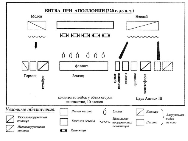 После этого упряжки с серпами на 65 лет исчезают из поля зрения источников, и мы встречаем их вновь лишь в битве при Аполлонии (220 г. до н. э.) между царем Антиохом III (223–187 гг. до н. э.) и восставшим против него сатрапом Мидии Молоном. Лаконичное описание битвы сохранилось лишь у Полибия (V,53–54). Молон захватил Месопотамию, разбил царских стратегов, но, опасаясь быть отрезанным от Мидии – своей основной базы – царскими отрядами, перешел на левый берег Тигра и встретил тут армию Антиоха недалеко от Аполлонии (совр. Барадан-Тепе). Количество войск с обеих сторон неизвестно132.