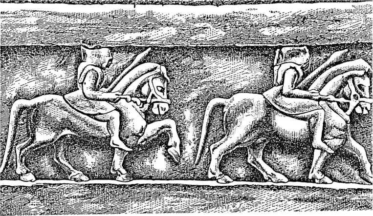 Лидийские всадники. Мраморный надгробный рельеф (VI в. до н. э.). Отметим, что всадники имеют тяжелые копья (ср.: Hdt., 1,79). Конники одеты в легкие хитоны и в (персидские?) башлыки.