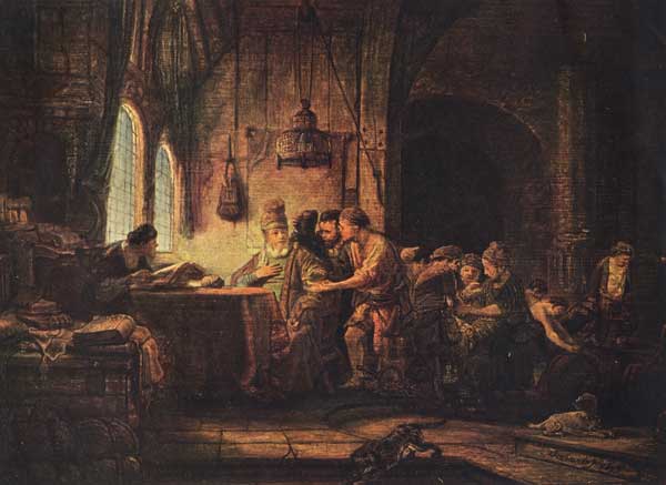 Такое же впечатление движения и жизни производит гравюра «Изгнание торгующих из храма». Но этот эстамп, в противоположность первому, проникнутому тихой радостью, полон борьбы и смятения. Фигура Христа, энергичная до грубости, скорее изображает не Всеблагого Учителя, а фанатика-анабаптиста времен борьбы с католичеством; по всей вероятности, Рембрандт в детстве присутствовал при последних иконоборческих беспорядках в Лейдене или его окрестностях. Но достаточно внимательно вглядеться в гравюру, чтобы вполне оценить ее достоинства. Какой контраст между мощным обликом Христа, преисполненного негодования против нарушающих святыню храма, и трусливыми и озлобленными лицами торгашей, бегущих от поднятой руки Его! Кругом полный хаос: торговцы стараются спасти свой товар, менялы подбирают деньги, упавшие от напора люди напрасно силятся оградить себя от ушибов. В глубине храма иудейские первосвященники и левиты, замечательно похожие на католических патеров, с иронией и невозмутимым спокойствием следят за бурной сценой. Группировка сделана так искусно, что, несмотря на большое количество фигур, гармония и цельность композиции нисколько не нарушены.