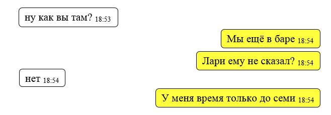 Все в этом месте было не так, словно оторвано от реальности. Единственное, что связывало «19:54» с обыденной действительностью было течение времени, которое своим размеренным ходом уже достигло отметки в шесть часов тридцать две минуты. И как раз в эту минуту Лари, с усилием опираясь на стол, поднялся и, одурманенный этанолом вперемешку с хмелем, нечётко, но крайне учтиво пробурчал: