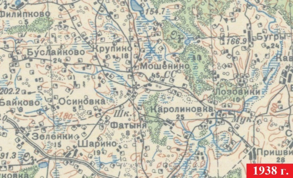«Карта Генерального штаба РККА» [4] по данной местности была «составлена с учётом всех материалов на декабрь месяц 1938 г.»: видим уже один населённый пункт Мошенино, с церковью и сельсоветом – обозначение СС. Названия ручьёв и озёр здесь отсутствуют.