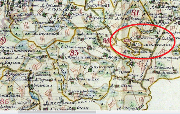 Согласно карте «Генерального плана <межевания> Невельского уезда» 1798 года [12] Мошенино существует как деревня «Мошенина» и находящееся рядом село «Мошенинъ» (орфография названий сохранена). Почему они выделены в отдельные землевладения? Этот вопрос нам проясняет та же карта и описание к ней, помещённое в тетрадь «Планы дач Невельского уезда Витебской губернии» (часть 1, с.26) [13]: дело в том, что село, то есть населённый пункт, в котором находился приходской храм (в который приходили на молебен не только мошенинцы, но и жители близлежащих, прикреплённых к Мошенинскому приходу, деревень) находился под управлением Полоцкой епархии, принадлежал к числу церковных земель, что и обозначено на карте буквами ЦЗ. А деревня – часть имения господ: на 4 августа 1785 года участок №19 «Мошенина сельцо с деревнями Надворнаго Советника Андрея Михайлова, сына Шильдера» [13, c.26].