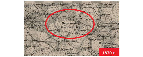 На карте 1870 года отдельно выделены Мошенинъ и, севернее, Мошенина. Обозначен деревянный храм, река Витевка, озёра Столбово, Гнилой Окунь. Чётко обозначены дороги. Из Мошенина ведёт предшественница современной асфальтированной дорога на Сбродова, Гнилова, Ф <ольварк> Королиновка, Хватынь, Буслайкова, Крупина [16].