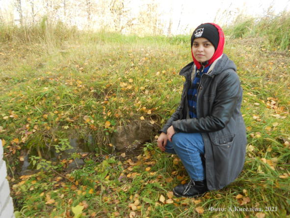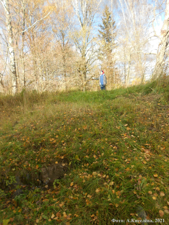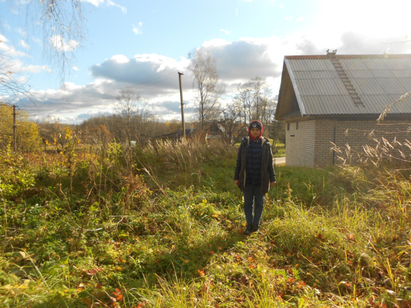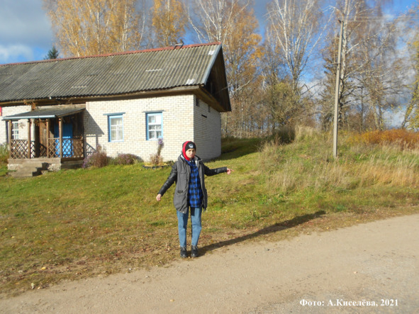 Татьяна Максимова у подножия холма, на котором находилась церковь Вознесения Господня в селе Мошенино (разрушена в 1943 году). Слева находится здание Мошенинского клуба и библиотеки. Фото А. Киселёвой, 2021 год
