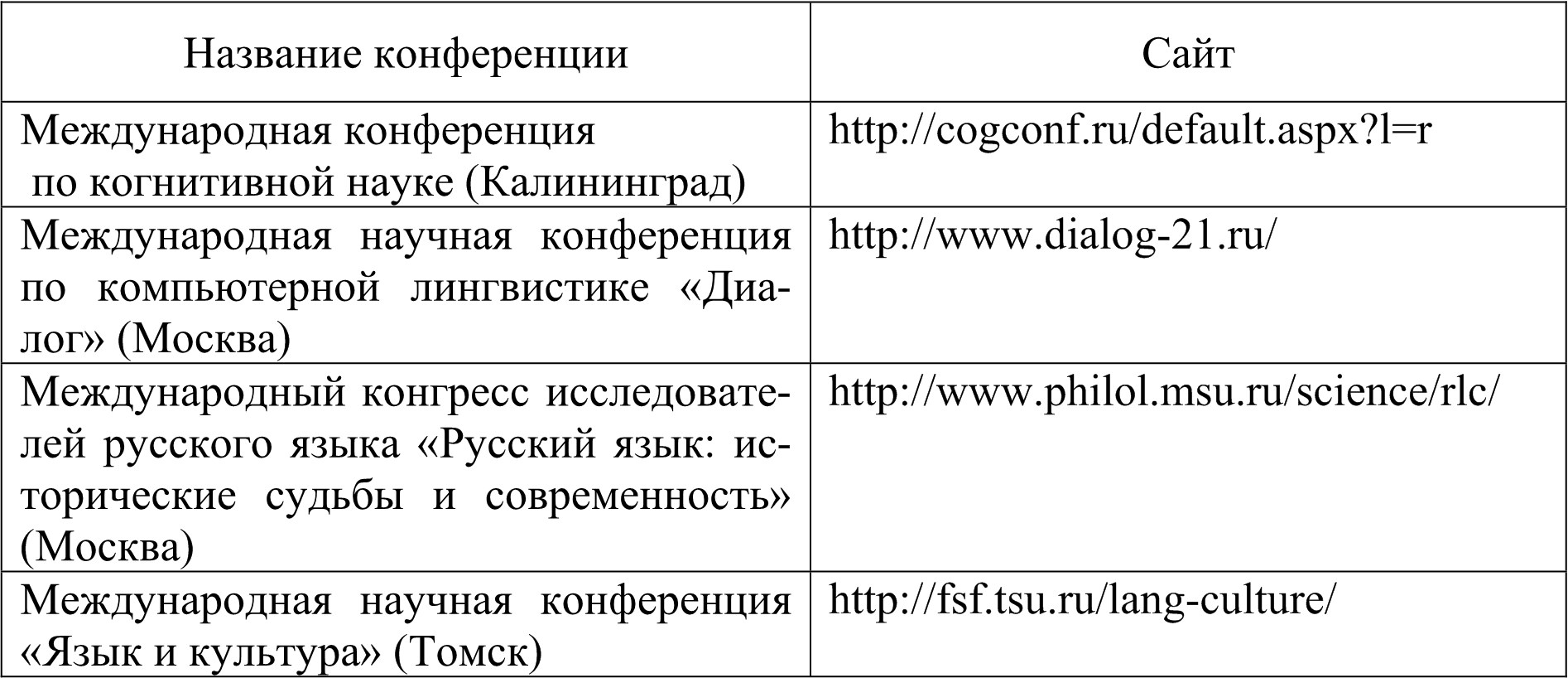 Просмотрите сборники научных трудов последних лет, материалы конференций. В табл. 1 представлены наиболее значимые для развития лингвистики – «трендовые» – конференции и сайты, где можно найти информацию о секционных и пленарных докладах, изучить их тематику, направления работы современных исследователей. Всё это может стать для вас «компасом» в выборе актуальной темы.
