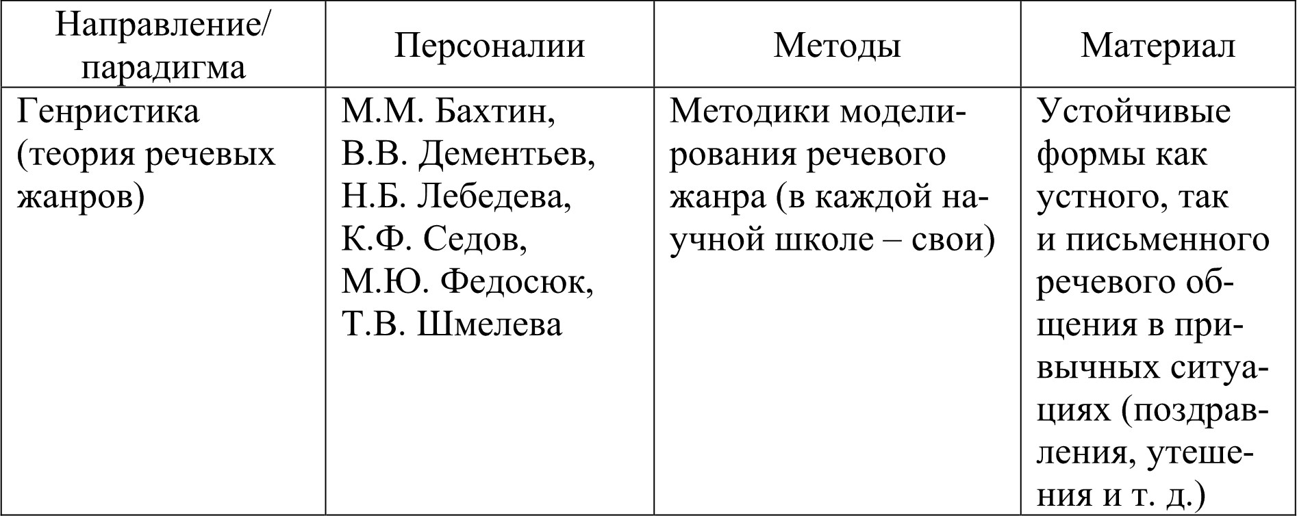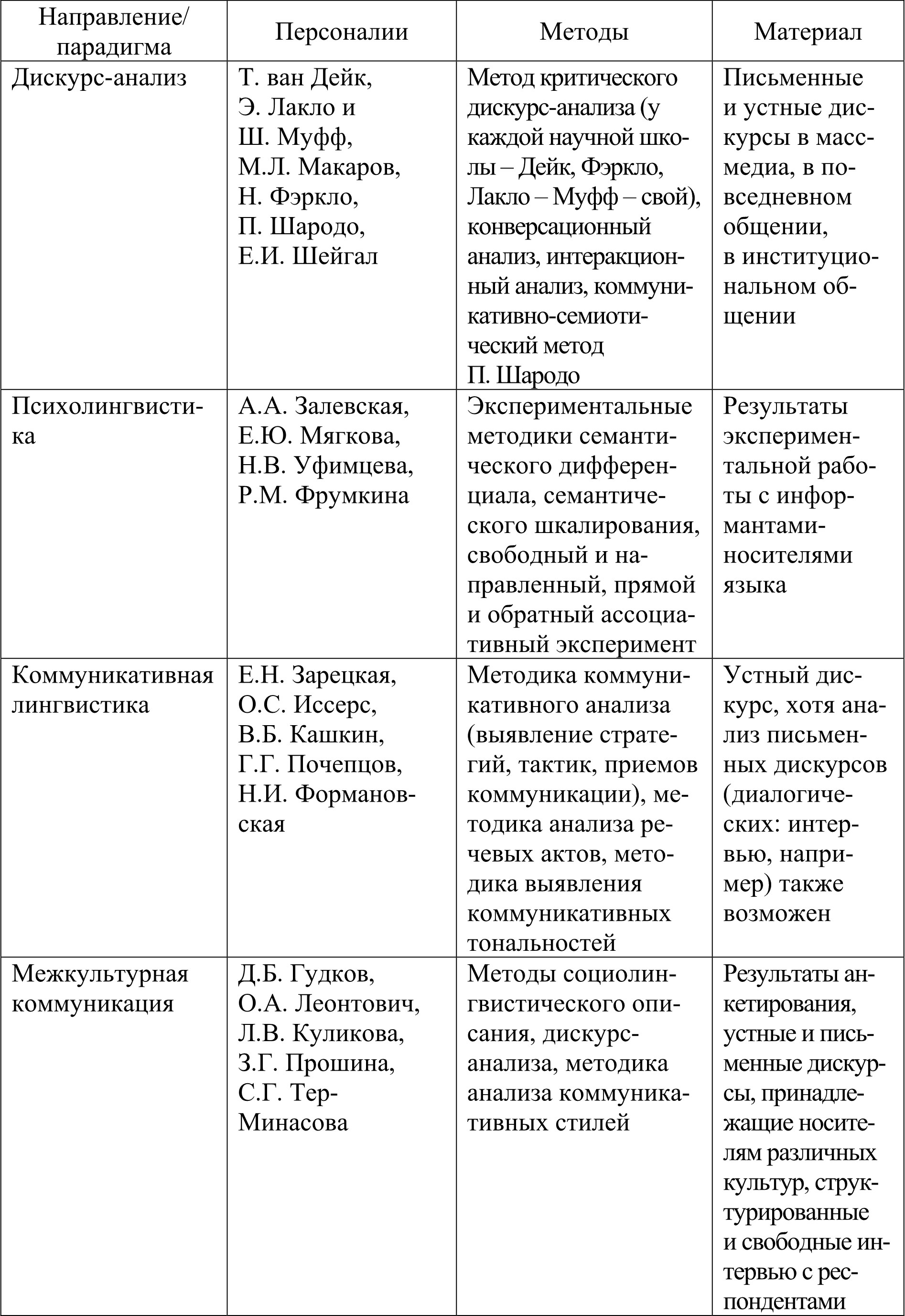 Изучая литературу по проблематике, близкой к вашей, советуясь и обсуждая развитие темы с научным руководителем, вы отберете теоретические понятия, необходимые для вашего исследования, методы и приемы анализа, которые послужат для работы с языковым материалом. В табл. 3 в несколько упрощенной и далекой от полноты форме представлены существующие в отечественной (преимущественно) лингвистике направления, школы и их представители, работы которых могли бы послужить отправной точкой в поисках нужной вам методологии.