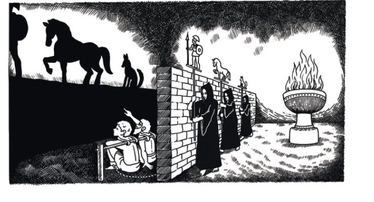 За этой стеной другие люди несут различную утварь, держа ее так, что она видна поверх стены; проносят они и статуи, и всяческие изображения живых существ, сделанные из камня и дерева…