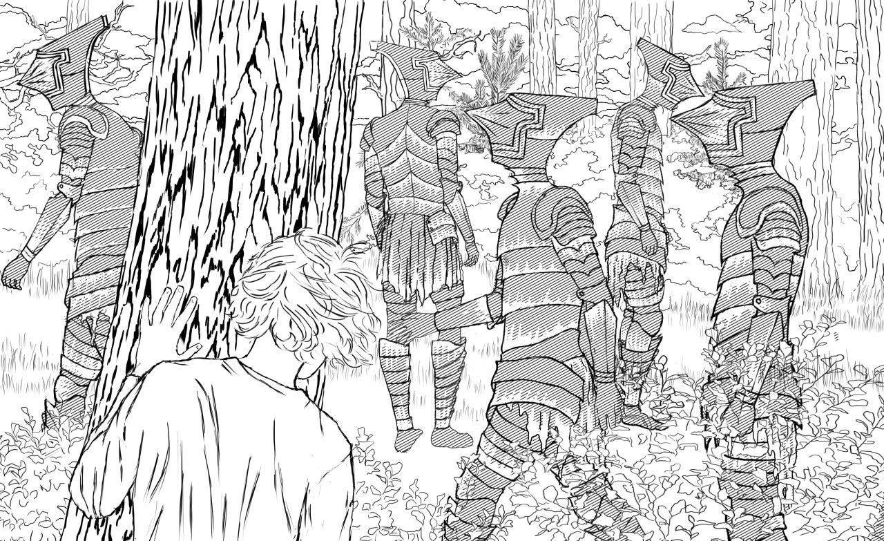 Остальные – трое мальчишек примерно моего возраста – стояли с другой стороны стены и возбуждённо что-то обсуждали. Я щёлкнул по хвосту верёвочника, чтобы он свился в клубок, и отдал Нилопе. Тем временем двое ушли куда-то дальше по стене, остался один – чуть пониже меня, но крепко сбитый, с хищной посадкой головы. На руке у него был самодельный браслет из гаек. Когда мы подошли, он даже не обернулся, лишь резко махнул рукой, мол, «Тише!» – и показал пальцем вдаль. Сперва я ничего не понял, но потом свернул пальцы в кольцо, чтобы было лучше видно, и разглядел… По дороге, обсаженной вишнями, в нашу сторону шли… Я не знал, как это назвать. Сперва я подумал – дети. Невысокие, в странных чёрных одеждах. Но потом один повернулся, и я увидел его голову. Это был не шлем, а будто кусок тёмного стекла, и внутри… там шевелилось что-то. Как тени от костра, только без огня. От одного их взгляда у меня засосало под ложечкой. Это не были бесы из проповедей дьякона. Это было хуже