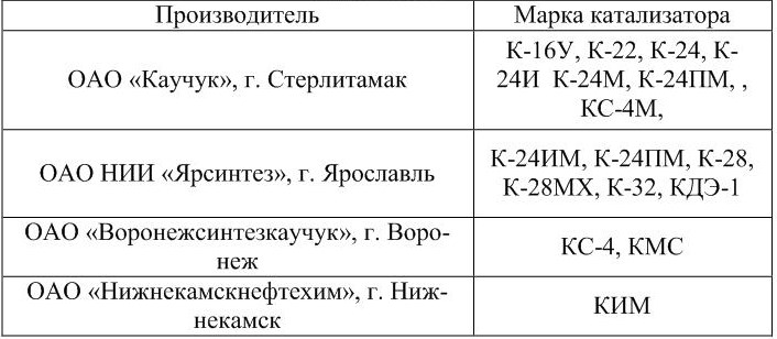 По мере изучения свойств ЖОК, они начали применяться и для дегидрирования изоамиленов в изопрен. Позже несколько фирм в России начали готовить на основе этого катализатора свои марки ЖОК, промотированные соединениями II-IV, VI групп периодической системы [3, 4] (табл. 1.1), но выход СТ оставался практически на таком же уровне.