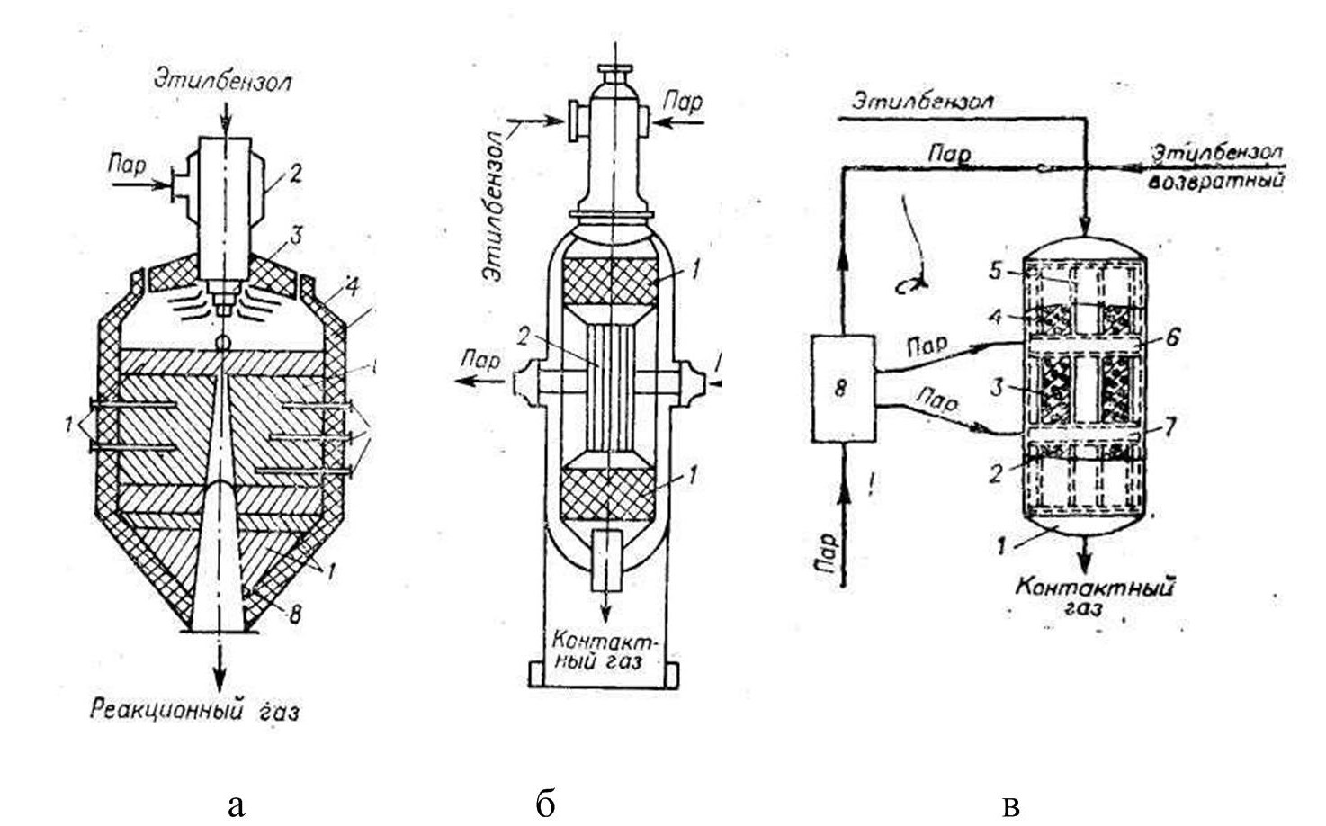 Разработка ЖОК была крупным скачком в промышленности дегидрирования ЭБ, его применение требовало нетрадиционного подхода к конструкциям реакторов. При таком большом выходе СТ, с учетом эндотермичности реакции, традиционный предварительный подогрев сырья и пара уже не обеспечивал требуемое количество тепла реакции. По мере продвижения реакционной массы по реактору наблюдалось снижение температуры катализатора по высоте слоя на 30-40 °C, что, в свою очередь, снижало активность катализатора и выход целевого продукта. Поэтому были созданы новые реакторы дегидрирования. Ряд таких схем приведен на рисунке 1.1.