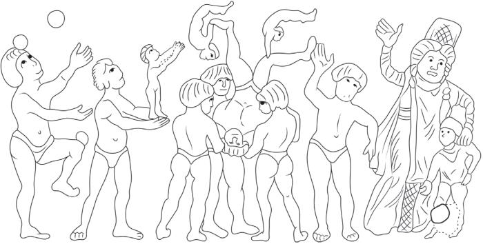 Рис. Ч6. Прорисовка фрагмента «Диптиха с цирковыми сценами». Перформансы акробатов и жонглеров на арене ипподрома (рис. Д. Т. Керимовой)