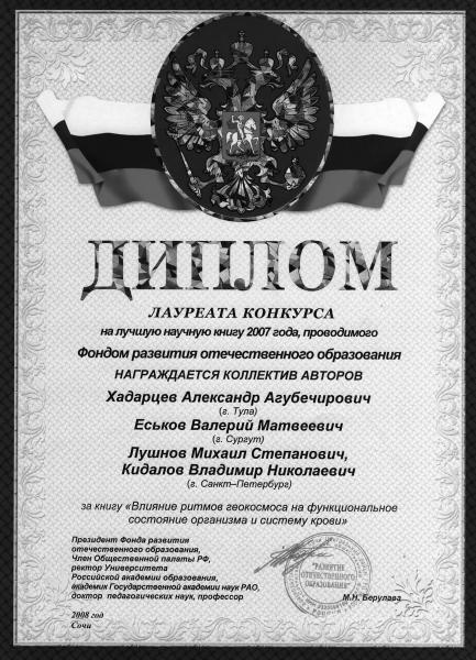 – Лушнов М. С., Кидалов В. Н., Хадарцев А. А., Еськов В. М. Влияние ритмов геокосмоса на функциональное состояние организма и систему крови: Монография. / Под ред. А. А. Хадарцева. – Санкт-Петербург – Тула: ООО РИФ «Инфра», 2007. – 188 с. (авторы получили диплом (рис. П. 1), монография стала лауреатом конкурса на лучшую научную книгу 2007 г., проводимого Фондом развития отечественного образования);