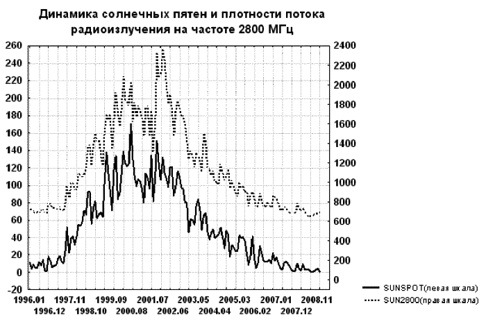 Временная изменчивость солнечной активности, выраженная количеством солнечных пятен и плотностью потока радиоизлучения на частоте 2800 МГц, представлена на рис. 1.1. Ход двух кривых очень похож, он отображает 11-летний цикл, с начала 1996 года значения увеличиваются, достигнув максимума в середине исследуемого периода, затем постепенно начинают уменьшаться. Максимум числа солнечных пятен (170) приходится на середину 2000 года, а максимум плотности потока (2350) – на начало 2002-го.