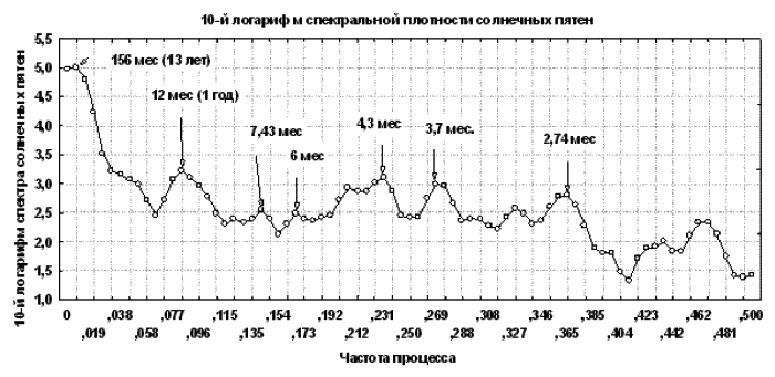 Рис. 1.2 показывает десятичный логарифм спектральной плотности солнечных пятен. График содержит большое количество периодичностей повторения явлений: 13 лет, 12 месяцев, 7,43 месяца, 6, 4,3, 3,7 и 2,74 месяца. Эти периоды синхронны со стационарной летальностью больных Санкт-Петербурга, описанной в главе 10 настоящей книги.