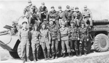 2 МСБ 2 МСП ОМСДОН во главе с подполковником Николаем Алексейчиком, настоящим батяней-комбатом, на военном параде в честь 40-летия Победы над фашистской Германией. Второй слева от него будущий Герой России лейтенант Андрей Крестьянинов. В центре офицерской группы капитан Игорь Ковалёв. 9 мая 1985 г.