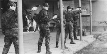 Наряду с мотострелковыми подразделениями, укреплялась и Учебная рота специального назначения (УРСН) 2 полка ОМСДОН, личный состав которой отлично себя зарекомендовал в предыдущих выездах в горячие точки. Командир этой роты «краповых беретов» майор СИ. Лысюк, продолжая традиции, заложенные её родоначальниками, будущими генералами В. И. Мальцевым и В. И. Булатовым, настоятельно требовал у командования коренного и значительного расширения штатов УРСН. Однако бюрократические рогатки закостенелой кадровой системы не пропускали разумные инициативы тех, кто не в кабинетах, а на передовой защиты целостности страны потом и кровью выстрадали эти предложения. Путём обмена опытом с лучшими отечественными («Альфа», «Вымпел») и зарубежными спецподразделениями, сотрудники УРСН формировали своё собственное «лицо», отходя от парадности различных показных занятий, на которые их толкали большие начальники из МВД. Кто только не смотрел эти «показухи» в стареньком спортзале роты. Здесь мелькали лица зарубежных глав государств и даже королев, всяких знаменитостей. На одном из таких «выступлений» побывала спортивная звезда-фигуристка Ирина Роднина, которая, делясь впечатлениями, откровенно сказала: «Конечно ребята молодцы, но ведь это просто цирк какой-то, а не настоящая работа в боевых операциях». Понимая справедливость не только слов прославленной фигуристки, но и требований времени, руководство УРСН всю военно-специальную подготовку перестраивало исходя из современного практического опыта. Так, например, приезд военной делегации Кубы повлиял на тактику обучения «краповых беретов» приёмам рукопашного боя. Этому поспособствовал спарринг кубинского спецназовца с одним из лучших рукопашников роты «Ш». Кубинец секунд десять с усмешкой уклонялся от всех «маваши- и йоко-гэри» нашего бойца, а затем короткими, но крайне болезненными и эффективными ударами, без махания по балетному ногой выше себя, быстро его одолел. Посещение УРСН сотрудниками антитеррористического подразделения «Кобра» Австрии помогло скорректировать и огневую подготовку наших спецназовцев. В частности, австрийцы никак не могли понять, почему бойцы спецназа сразу идут на сближение с условным противником (преступниками), применяя для их обезвреживания в основном приёмы самбо и карате. По их словам, австрийские законы позволяют в случаях сопротивления со стороны преступников, упор делать на угрозу применения или сразу применение огнестрельного оружия. Большой вклад в подготовке «краповых беретов» тому, что необходимо в бою внёс заместитель командира роты капитан В. Н. Путилов[11]. Этот офицер, прекрасно владея всеми видами огнестрельного оружия и рукопашного боя, прошёл школу Афганистана, где за мужество был награждён медалью «За боевые заслуги». Вспоминаю эпизод, когда и военная контрразведка внесла свою маленькую лепту в формирование основ подготовки УРСН по принципу применять силу с умом. 19 мая 1985 года на стадионе Динамо под организацией B. C. Чудакова 3-е ГУ КГБ проводило военно-спортивный праздник, посвящённый 40-летию Великой Победы. В ходе торжественного открытия праздника личный состав УРСН выступил с показательными занятиями перед контрразведчиками и членами их семей. Прекрасно исполняя приёмы рукопашного боя и каратэ, «краповые береты» впервые продемон