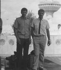 Старший опер майор Е. В. Бушуев и оперуполномоченный капитан Ю. В. Калугин (в будущем генерал) в аэропорту Звартноц. Возвращение в Москву после кровавых событий 1987 года в городе Сумгаит
