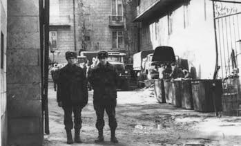 Только прибыли и начали размещаться в гостинице Нахичевань, как вокруг здания, несмотря на поздний вечер, стали собираться группы граждан. Отдельные из них, хитро улыбаясь, вступали в контакт с военнослужащими и задавали вопросы типа: «Зачем и откуда прилетели? Сколько войск вообще с вами прибыло? Будете ли стрелять по народу, если прикажут? Как фамилия командира части?». Поговорив эти «дознаватели» тут же подходили к телефону автомату и кому-то докладывали на азербайджанском языке. Видно действовали они от разных структур НФА, так как в момент, когда образовалась толпа у телефона, один из «соглядатаев» пытался вне очереди пробиться к заветной трубке. Дело у них чуть до драки не дошло[19]. До двух часов ночи полк размещался в гостинице, организовав усиленную охрану по всему периметру здания, а также связь со штабом и взаимодействующими частями. На ночь ко мне в номер подселили корреспондента еженедельника «Союз» (газеты «Известия») Николая Александрова, по его словам ранее работавшего в милиции и издавшего книгу о МУР в 1988 году. Утром, после завтрака из сухого пайка, ко мне с докладом явился оперуполномоченный лейтенант В. В. Краснобаев, успевший опросить обслуживающий персонал из числа славян. Последние были в панике, так как в их адрес систематически звучали угрозы расправы: «Сейчас покончим с армянами, за вас примемся! Убирайтесь в свою Россию!» Многие из русских через родственников в других городах СССР вывесили объявления об обмене, а в Баку о продаже своих квартир. Все благодарили за прилёт наших войск, но высказывали неверие в то, что удастся навести порядок и вернуть прежнюю мирную жизнь. По их мнению, главной причиной этого являлись не только отобранный у Азербайджана Нагорный Карабах, но и многочисленные группы азербайджанцев, депортированных из Армении (в основном из Еревана) к себе на родину. Сами бакинцы за агрессивность и злобу прозвали их «еразами» (ереванский азербайджанец)[20]. Сепаратистские силы и НФА активно использовали неустроенных и безработных, слонявшихся без дела «еразов» в самых провокационных и преступных акциях, разжигая националистическую истерию.