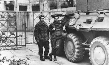 Мы свой долг выполнили, устраняя «ляпы» Горбачёва. В Баку восстановлен порядок, но «контра» лишь затаилась. Перед вылетом в Москву командир 2 МСП полковник В. В. Ракитин (в центре), справа от него автор, слева подполковник Ю. А. Мидзюта, крайний слева майор А. Е. Берестнев. На заднем плане капитаны С. А. Макаров и И. В. Овчинников