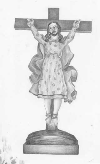 Это не Иисус в платье, а католическая святая – бородатая дева Вильгефортис. Она молилась, чтобы отец не выдал ее замуж за нелюбимого принца, и у нее выросла борода, а взбешенный папа ее распял. Вильгефортис была канонизирована и почитается 20 июля