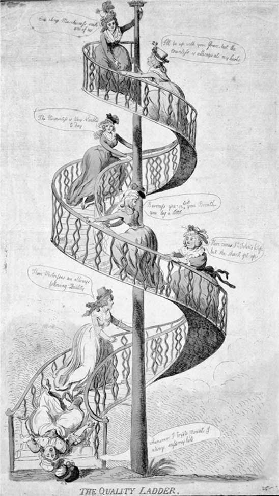 Карьерная лестницаДевушки XVIII века гонятся за титулами. В самом низу лестницы лежит рядовая любовница с оголенной грудью – она не может подняться, на ступень выше нее – жена баронета, ее обогнала баронесса, над ней возвышается виконтесса, выше них поднялась графиня, перед ней маркиза, на самом верху герцогиня, которой остается одна ступень до короны. В общем, при удачном замужестве вполне реальные перспективы!