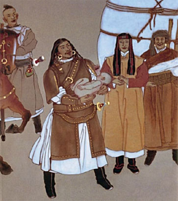 Есухэй-батор и Огэлун с новорожденным Тэмужином. Современная настенная живопись. Мемориал Чингисхана в Ордосе (КНР)