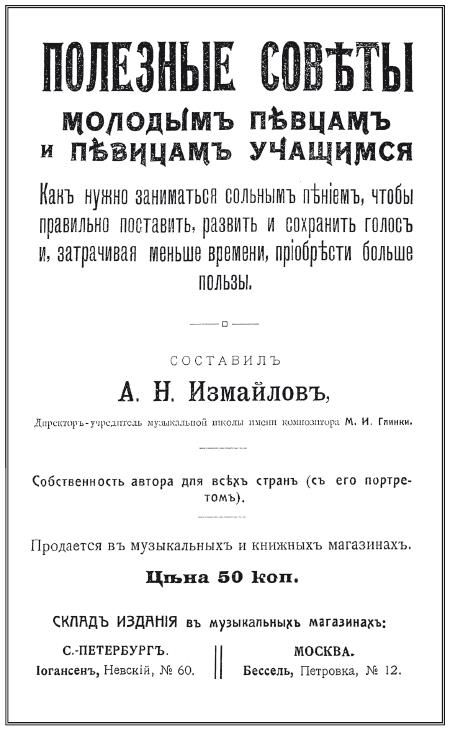 This work includes clear, sound, simple advice for young singers collected by the experienced talented musician of his time, the opera artist, the nephew of M.L Glinka-A.N. Glinka-Izmailov (1856–1942). On the pages of the book are stated the most important, elementary and necessary things for the students of singing: how to preserve the voice, how to do the lessons, how to learn scales, arpeggios and other exercises, how to prepare oneself for a concert, etc.