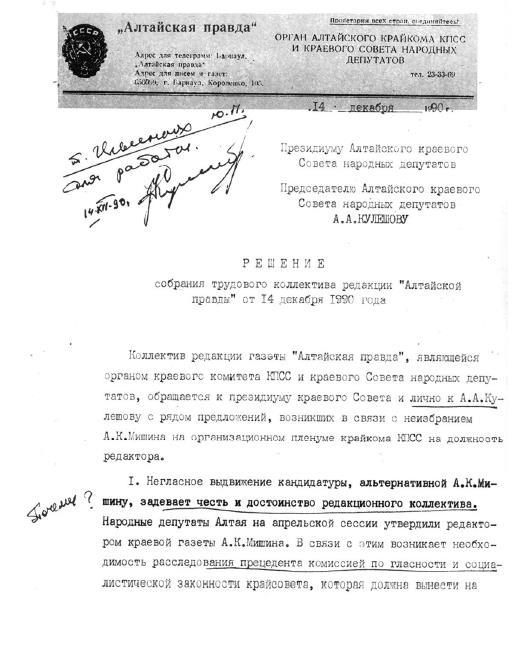 4. Неоправданно затянулась регистрация «Алтайской правды», несмотря на то, что редакционный Устав и программа деятельности газеты приняты коллективом журналистов и, более того, согласованы с представителями крайкома КПСС и крайсовета, которые присутствовали в редакции на общем собрании коллектива при окончательной доработке этих документов. Волокита с регистрацией в значительной степени поспособствовала возникновению конфликтной ситуации, привела к юридическому казусу, когда у газеты оказалось на данный момент два редактора. Настоятельно просим ускорить решение этих вопросов.