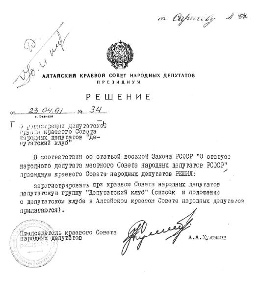 ПОЛОЖЕНИЕ О ДЕПУТАТСКОМ КЛУБЕ В АЛТАЙСКОМ КРАЕВОМ СОВЕТЕ НАРОДНЫХ ДЕПУТАТОВ[9]