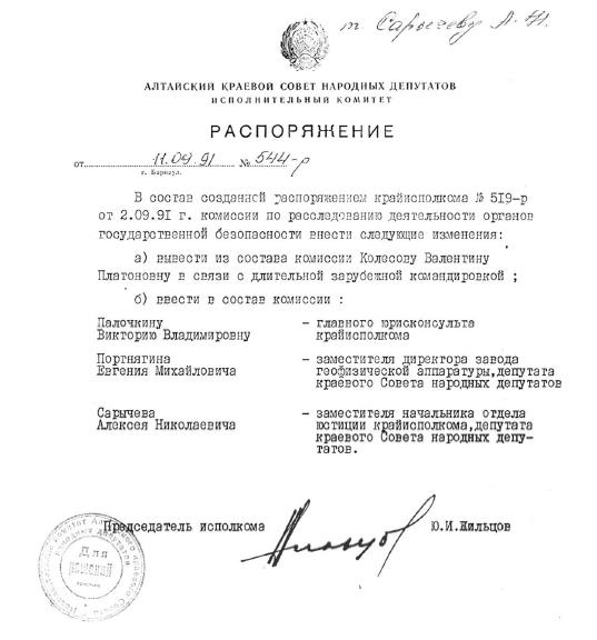 28-29 августа сессия алтайского краевого Совета народных депутатов рекомендовала на должность главы администрации края А. Г. Назарчука, которого мы можем характеризовать как противника демократических преобразований в крае и РСФСР, человека, фактически признавшего ГКЧП. В то же время на сессии не получили поддержки большинства депутатов кандидатуры демократически настроенных народных депутатов РСФСР Ю. И. Жильцова и В. Ф. Райфикешта. Мы просим учесть это при окончательном рассмотрении этого вопроса.
