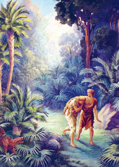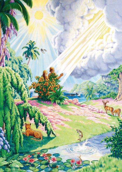 Жили Адам и его жена Ева в большом прекрасном саду, который был для них создан Самим Богом. Как чудно и красиво там было! На лугах цвели самые прелестные цветы, журчали прохладные источники, искрились светлые, чистые ручейки. В саду было много кустов со сладкими ягодами и много деревьев с яблоками, грушами, вишнями и орехами. На лужайках паслись овечки, козы и коровы. Птицы с разноцветными перьями летали с дерева на дерево и на ветвях строили свои гнёзда. С утра до вечера в саду раздавались их весёлые песни.