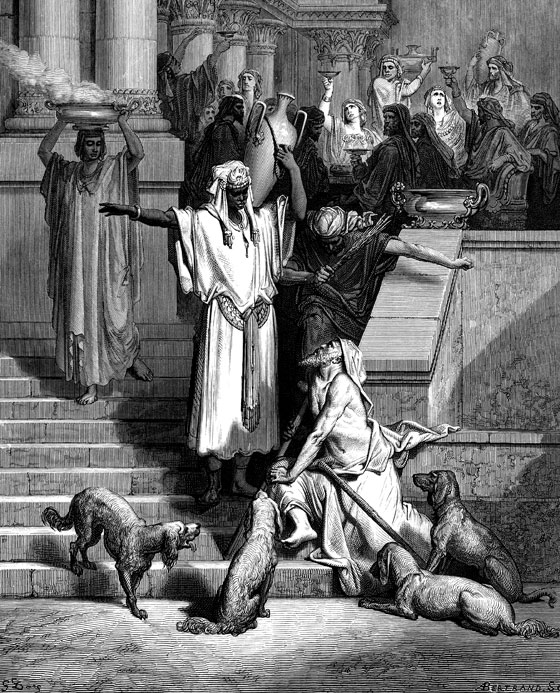 Каждый день он имел отличный обед и ужин. Какие вкусные кушанья подавались к его столу! Много разных дорогих вин ставили на стол, когда богач садился обедать, ужинать или завтракать. Сколько у него собиралось гостей, с которыми он ежедневно пировал! А в это время у ворот его дома весь в струпьях лежал один нищий по имени Лазарь. Этот голодный бедняк рад был объедкам, которые оставались от стола богача и выбрасывались вон. Возле этого несчастного, который едва мог сдвинуться с места, бродили собаки и лизали его раны.