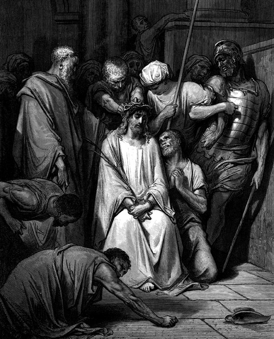 Тогда Пилат велел бить Иисуса. Воины увели Его во двор, надели на Него багряницу (красную одежду), сплели венок из терния (из кустарника, на ветках которого есть большие и острые, как иглы, колючки), возложили этот венок Ему на голову, дали в правую руку палку и, становясь перед Ним на колени, издевались над Господом, кланялись и с насмешкой говорили: «Радуйся, Царь иудейский!», били по щекам, тростью по голове и плевали Ему в лицо.