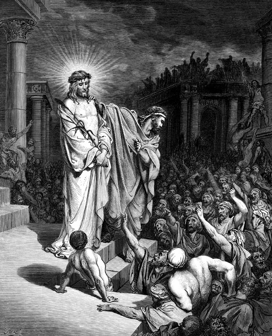 Пилат опять вышел к иудеям и сказал: «Я выведу Его к вам, чтобы вы видели, что не вижу за Ним никакой вины». Вывели избитого, израненного, всего в крови Иисуса. Пилат думал, что иудеи сжалятся, увидев Его в таком состоянии. Указывая на Христа, он сказал: «Это – человек! Неужели вам не жалко Его? Он так скромен, что молчит и даже не оправдывается».