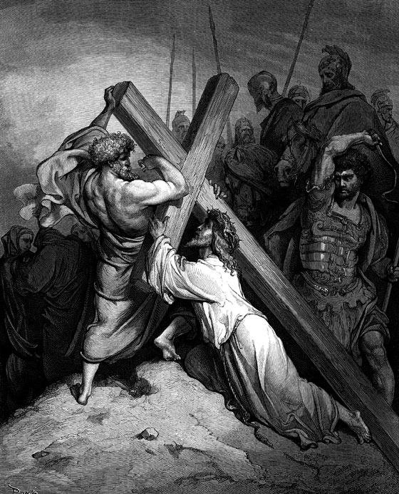 Воины, которым Иисус Христос был отдан на мучения, наконец устали Его бить и повели на распятие. Господа заставили нести крест. Вспомните, друзья мои, что вынес Учитель в эту ночь. Он молится и скорбит в саду Гефсиманском. Ему так тяжело, что кровавый пот льется градом. Затем появляется Иуда-предатель, показывает иудеям Иисуса, Его связывают и ведут сначала к Анне, потом к Каиафе в синедрион, к Пилату, к Ироду и, наконец, снова к Пилату. И везде над Ним издеваются, везде мучают и бьют. Измученный, избитый до полусмерти, Он не может нести крест и падает на дороге. Воины хватают первого встречного человека, одного киринеянина Симона, возвращавшегося с поля, и заставляют его нести крест Христа.